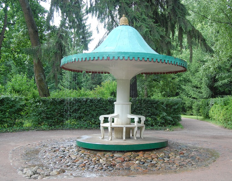 Создан фонтан-шутиха «Зонтик» в Петергофе для шуток над гостями парка. Усталые гости в праздничных нарядах